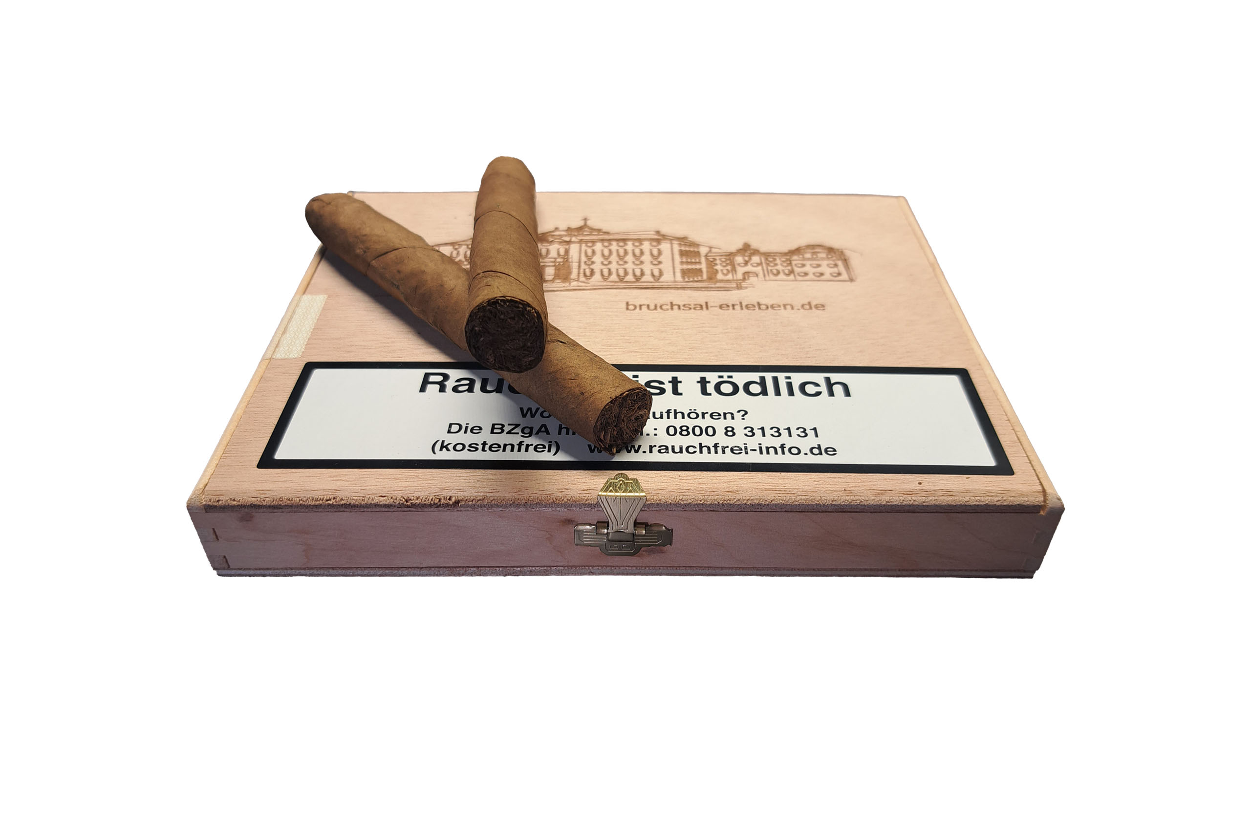 Die Corona-Zigarren bestehen aus einer vollmundigen Mischung und werden in einer einzigartigen Holzschatulle als exklusive Bruchsal-Edition in der Touristinformation angeboten.